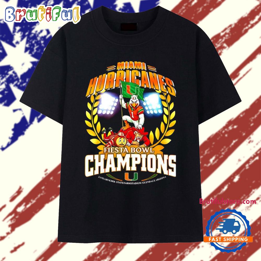 Product details: 2025-26 CFP Fiesta Bowl Champions Miami Hurricanes mascot T Shirt