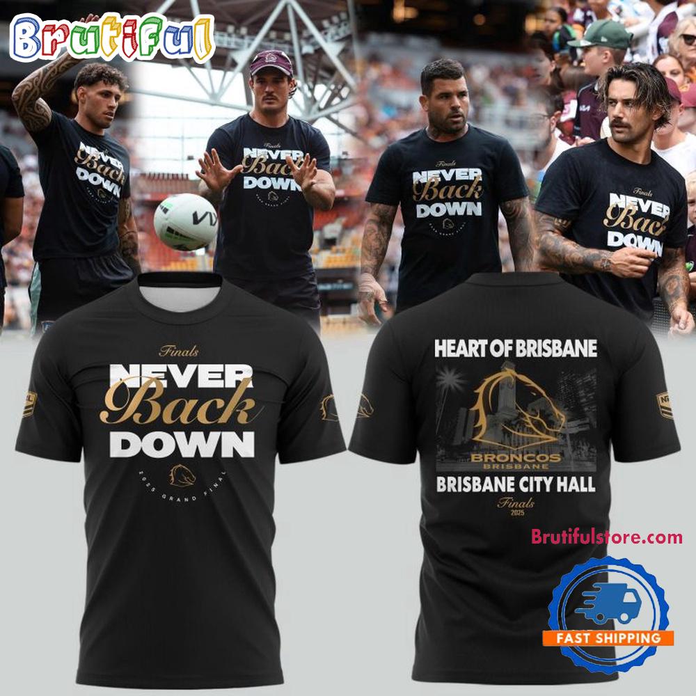 Photos Of Brisbane Broncos NEVER BACK DOWN City Hall Finals 2025 Limited Edition T Shirt