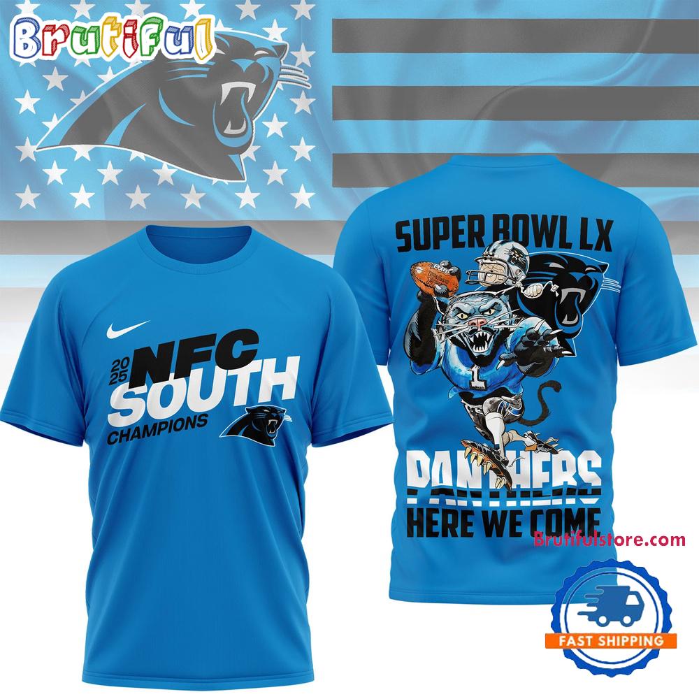 Product details: Carolina Panthers NFL 2025 Division Champions 3D Shirt, Super Bowl LX Panthers Here We Come Shirt