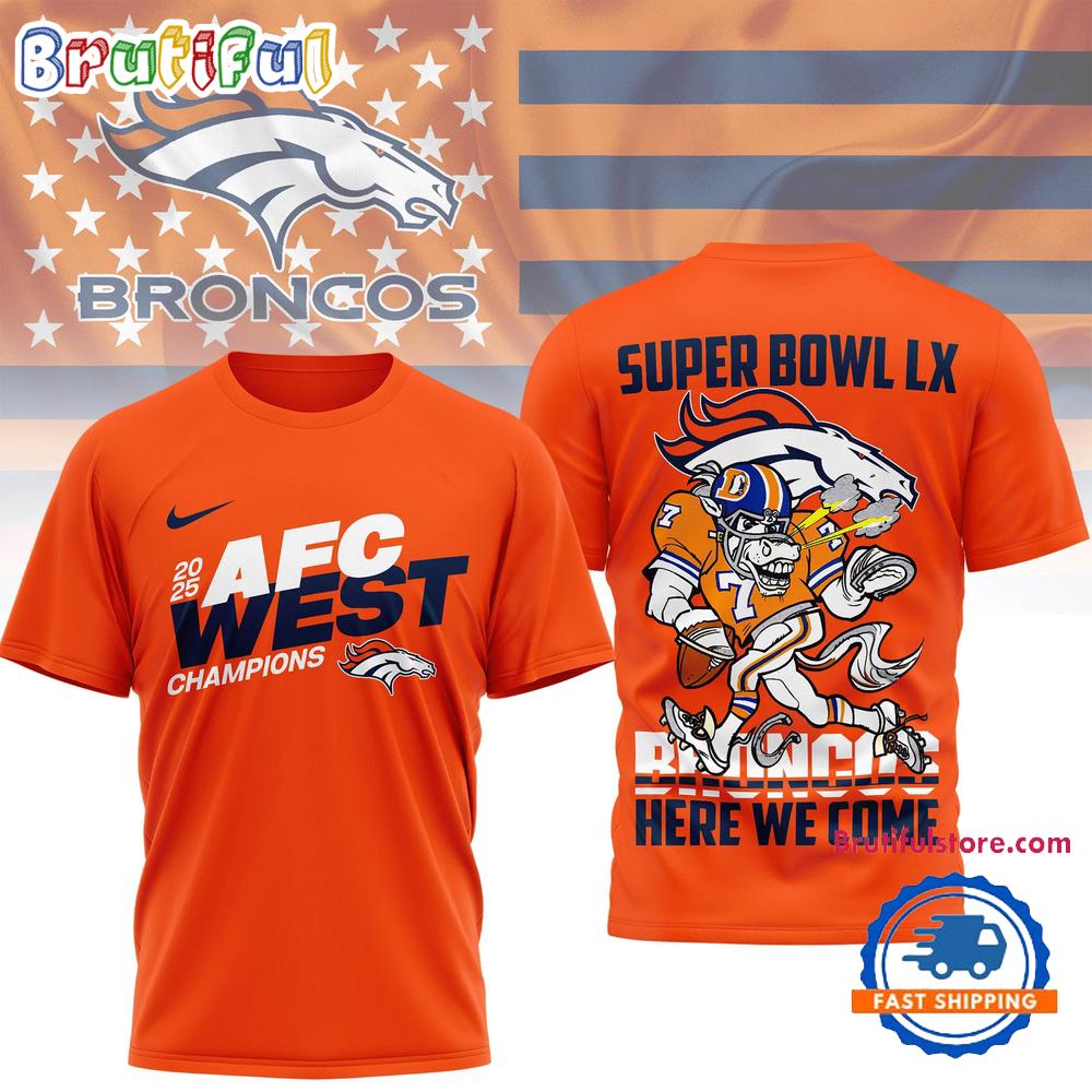 Product details: Denver Broncos NFL 2025 Division Champions 3D Shirt, Super Bowl LX Broncos Here We Come Shirt