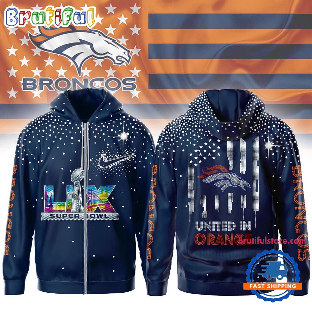 Product details: Denver Broncos NFL 2026 Super Bowl United in Orange Zip Hoodie Shirt