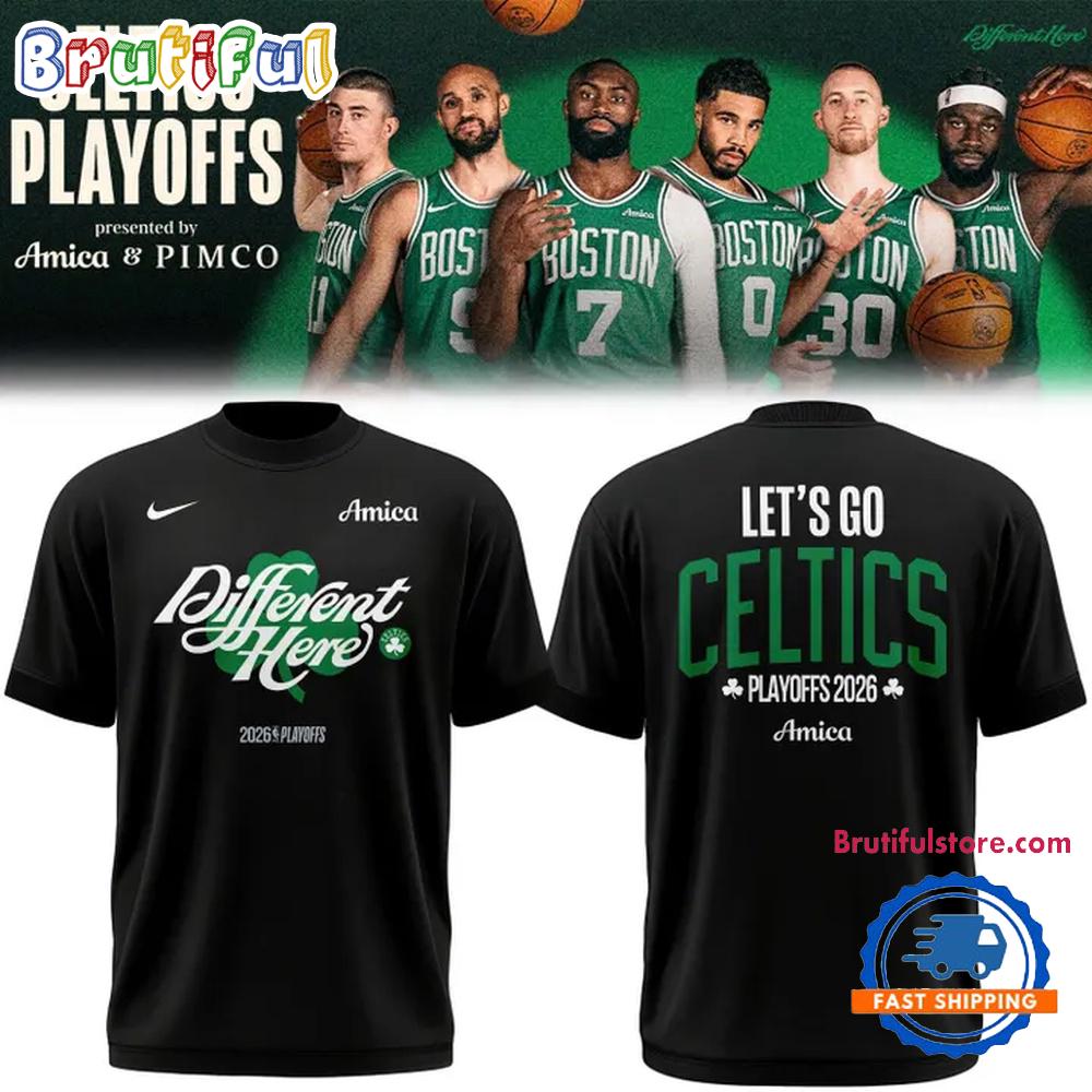 Different Here Playoffs 2026 Boston Celtics T Shirt The 3D Hoodie is a fashion statement that goes beyond the ordinary. Using advanced printing technology, it brings designs to life with depth and vividness. Crafted from high-quality materials, it offers comfort and durability. The three-dimensional graphics create a captivating effect that’s perfect for casual wear or making a bold statement. Whether you’re expressing your fandom or showcasing your unique taste, the 3D Hoodie is a wearable work of art that sets you apart from the crowd. Embrace both style and individuality with this distinctive fashion piece.