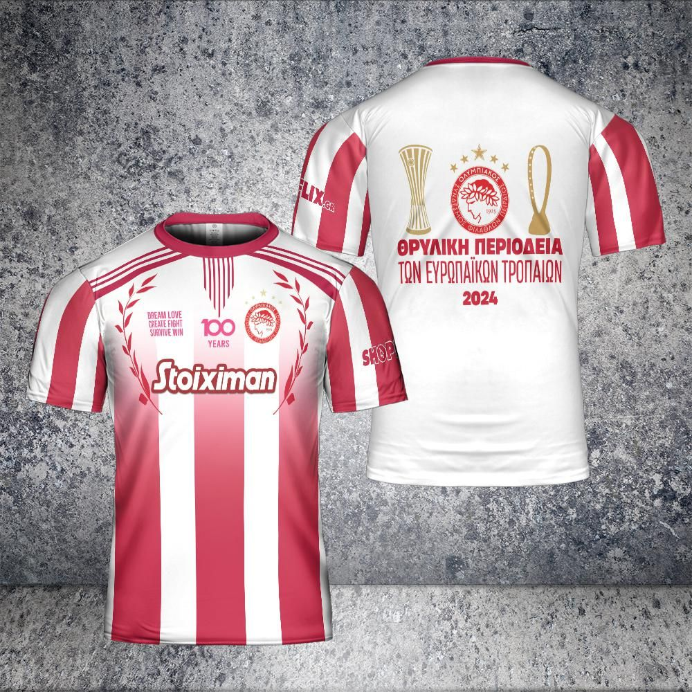 Dream Love Create Fight Survive Win 100 Years Olympiacos 3D T-Shirt is a fashion statement that goes beyond the ordinary. Advanced printing technology brings designs to life with depth and vividness. Crafted from high-quality materials, it offers comfort and durability. The three-dimensional graphics create a captivating effect that’s perfect for casual wear or making a bold statement. Whether you’re expressing your fandom or showcasing your unique taste, the3D T-Shirt is a wearable work of art that sets you apart from the crowd. Embrace both style and individuality with this distinctive fashion piece.