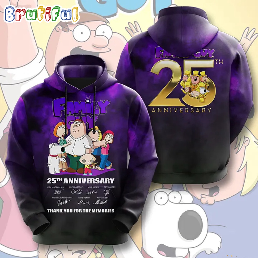 Family Guy 25th Anniversary Thank You For The Memories Hoodie The 3D Hoodie is a fashion statement that goes beyond the ordinary. Using advanced printing technology, it brings designs to life with depth and vividness. Crafted from high-quality materials, it offers comfort and durability. The three-dimensional graphics create a captivating effect that’s perfect for casual wear or making a bold statement. Whether you’re expressing your fandom or showcasing your unique taste, the 3D Hoodie is a wearable work of art that sets you apart from the crowd. Embrace both style and individuality with this distinctive fashion piece.