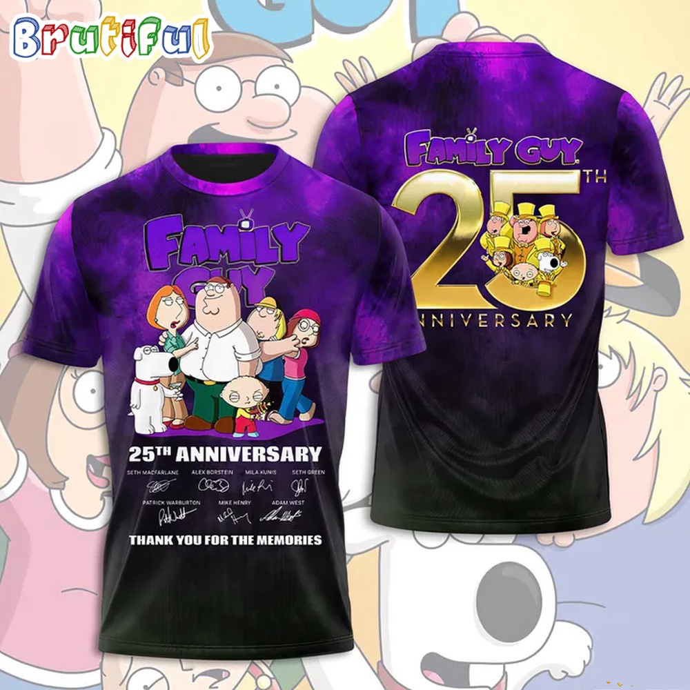 Family Guy 25th Anniversary Thank You For The Memories T Shirt The 3D Hoodie is a fashion statement that goes beyond the ordinary. Using advanced printing technology, it brings designs to life with depth and vividness. Crafted from high-quality materials, it offers comfort and durability. The three-dimensional graphics create a captivating effect that’s perfect for casual wear or making a bold statement. Whether you’re expressing your fandom or showcasing your unique taste, the 3D Hoodie is a wearable work of art that sets you apart from the crowd. Embrace both style and individuality with this distinctive fashion piece.
