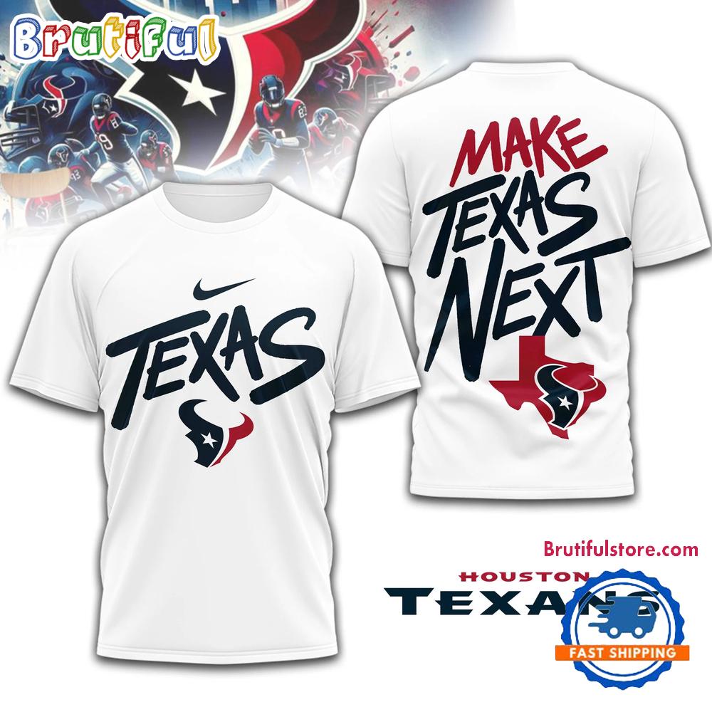 Houston Texans 2026 NFL Make Texas Next White 3D Shirt The 3D Hoodie is a fashion statement that goes beyond the ordinary. Using advanced printing technology, it brings designs to life with depth and vividness. Crafted from high-quality materials, it offers comfort and durability. The three-dimensional graphics create a captivating effect that’s perfect for casual wear or making a bold statement. Whether you’re expressing your fandom or showcasing your unique taste, the 3D Hoodie is a wearable work of art that sets you apart from the crowd. Embrace both style and individuality with this distinctive fashion piece.