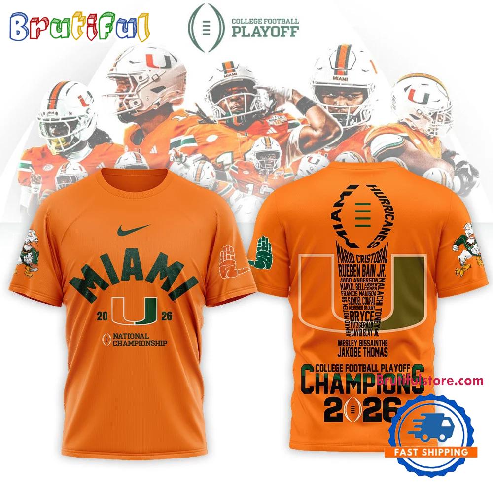 Miami Hurricanes 2026 NCAA College Football Playoff Champions Orange T Shirt The 3D Hoodie is a fashion statement that goes beyond the ordinary. Using advanced printing technology, it brings designs to life with depth and vividness. Crafted from high-quality materials, it offers comfort and durability. The three-dimensional graphics create a captivating effect that’s perfect for casual wear or making a bold statement. Whether you’re expressing your fandom or showcasing your unique taste, the 3D Hoodie is a wearable work of art that sets you apart from the crowd. Embrace both style and individuality with this distinctive fashion piece.