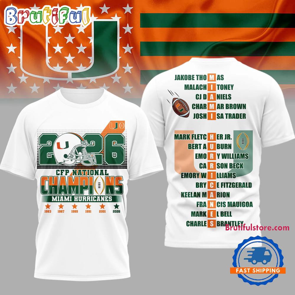 Photos Of Miami Hurricanes NCAA 2026 CFP Champions White 3D Shirt