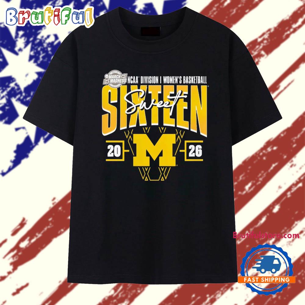 Product details: Michigan Wolverines 2026 NCAA Women’s Basketball Tournament March Madness Sweet 16 Court Shot T Shirt