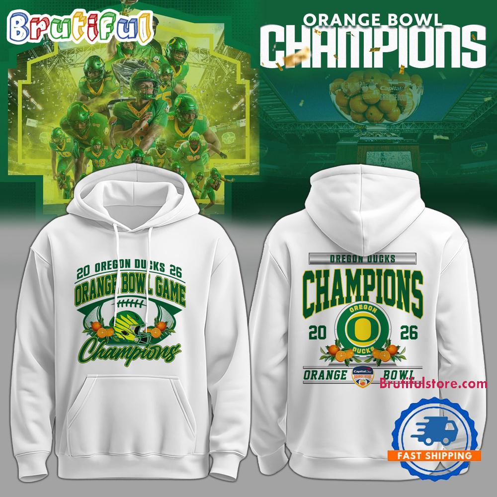 Photos Of Oregon Ducks Football 2026 Orange Bowl Champions Limited Edition White Hoodie