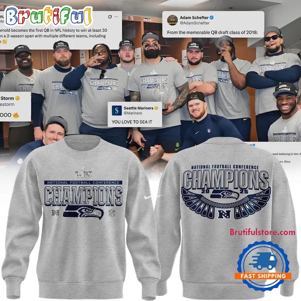 Photos Of Seattle Seahawks Heather Gray 2025 NFC Champions Locker Room Trophy Collection Sweatshirt