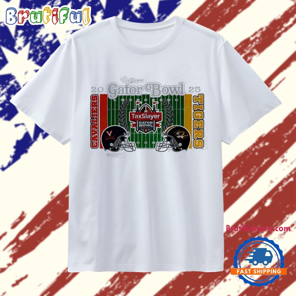 Product details: Virginia Cavaliers vs Missouri Tigers 2025 Taxslayer Gator Bowl 2 team helmet T Shirt